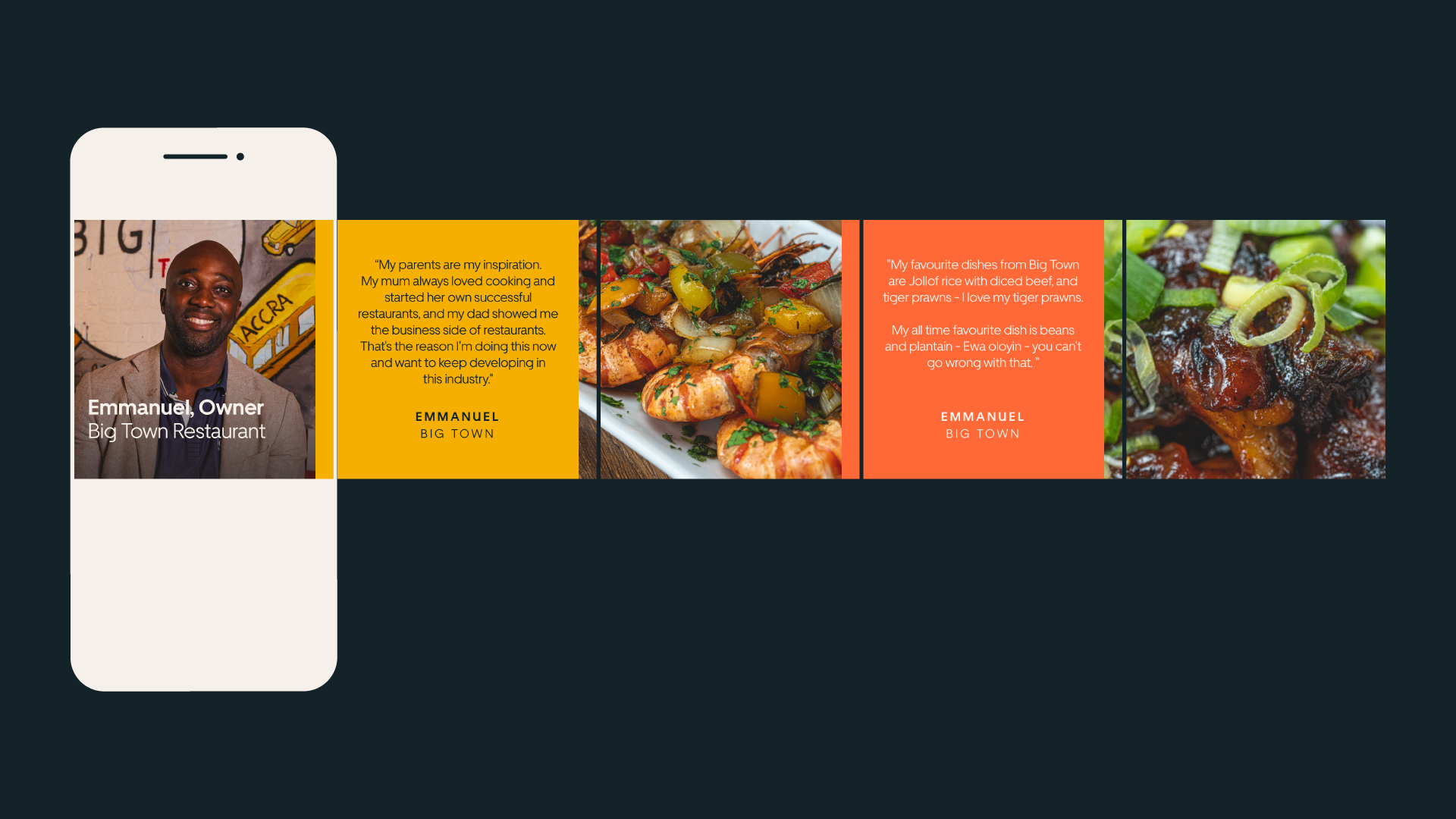 In October 2020, I helped expand and build new social assets around Black History Month, where we would focus on black owned restaurants in the UK. For this project we looked into using more of the secondary color palette to bring some more color and life to the storytelling.