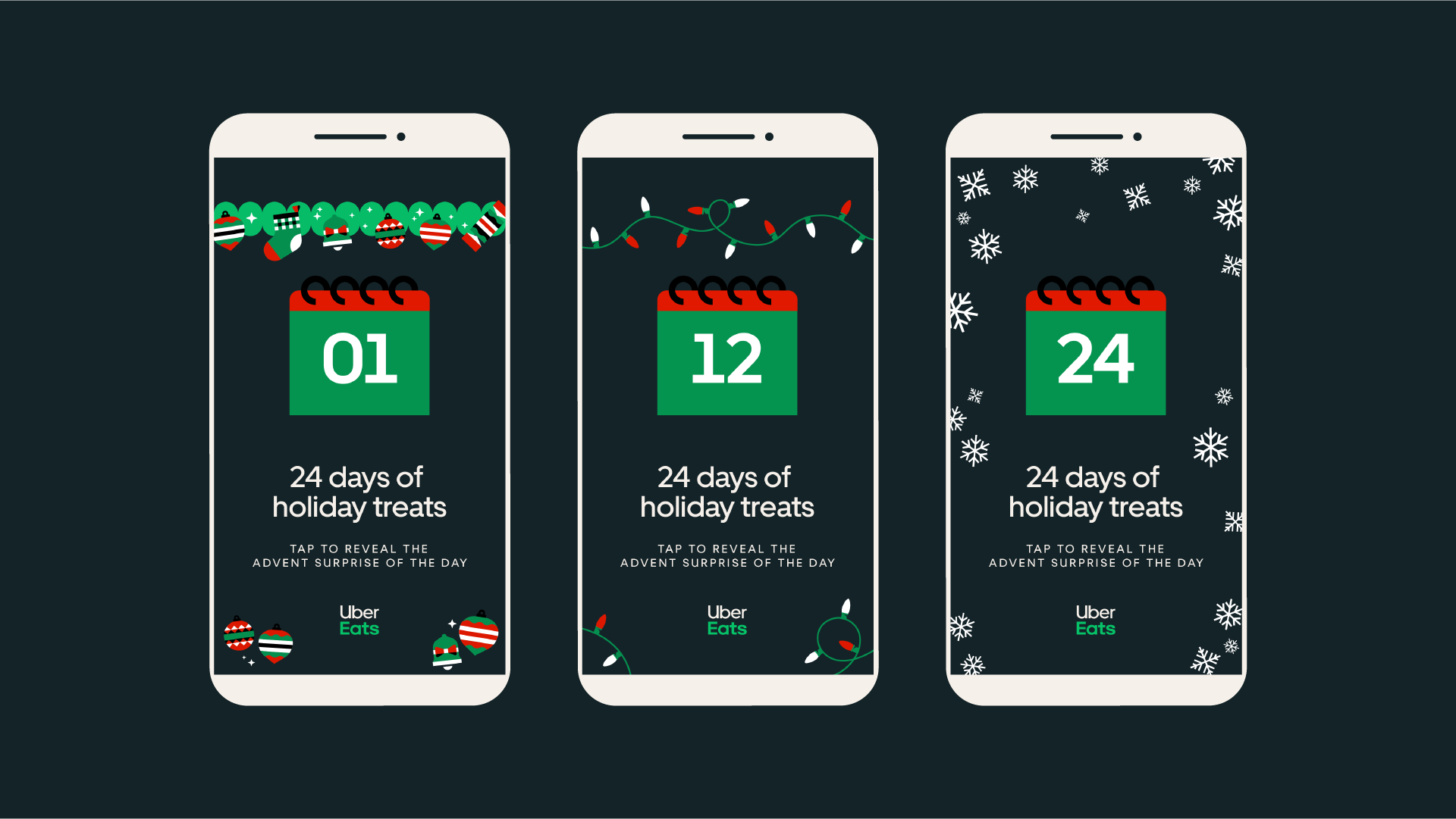 For the holiday season I developed a custom template for social media that Uber could use to promote 24 daily deals in December. The goal was to promote the deals in a new and captivating way while still respecting their brand guidelines.